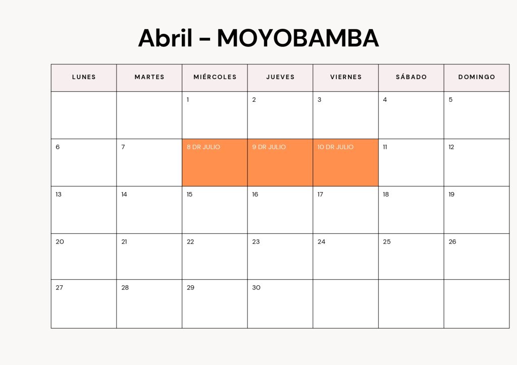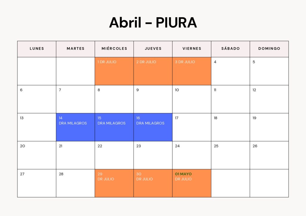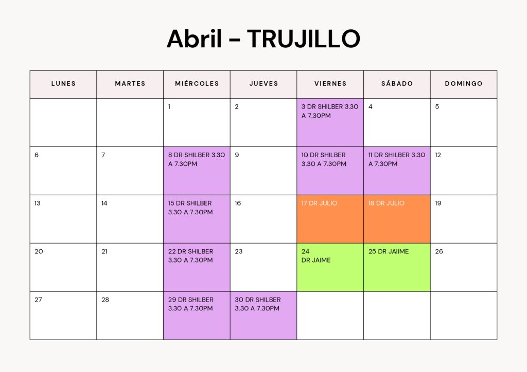 Consulta el calendario de atención médica correspondiente a nuestra sede DermaPiel – Tarapoto. Aquí podrás ver qué médicos atienden cada día del mes y planificar tu visita con anticipación.